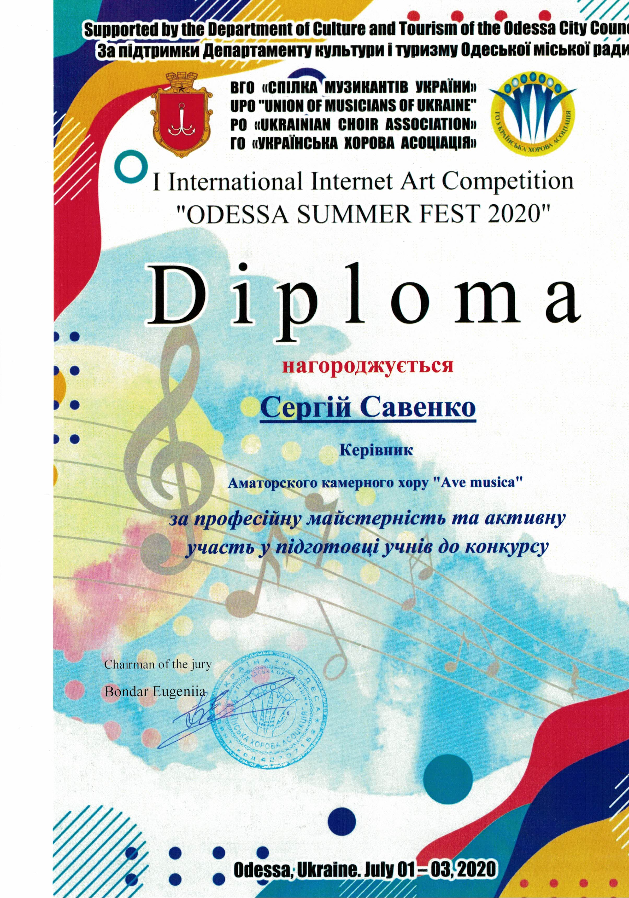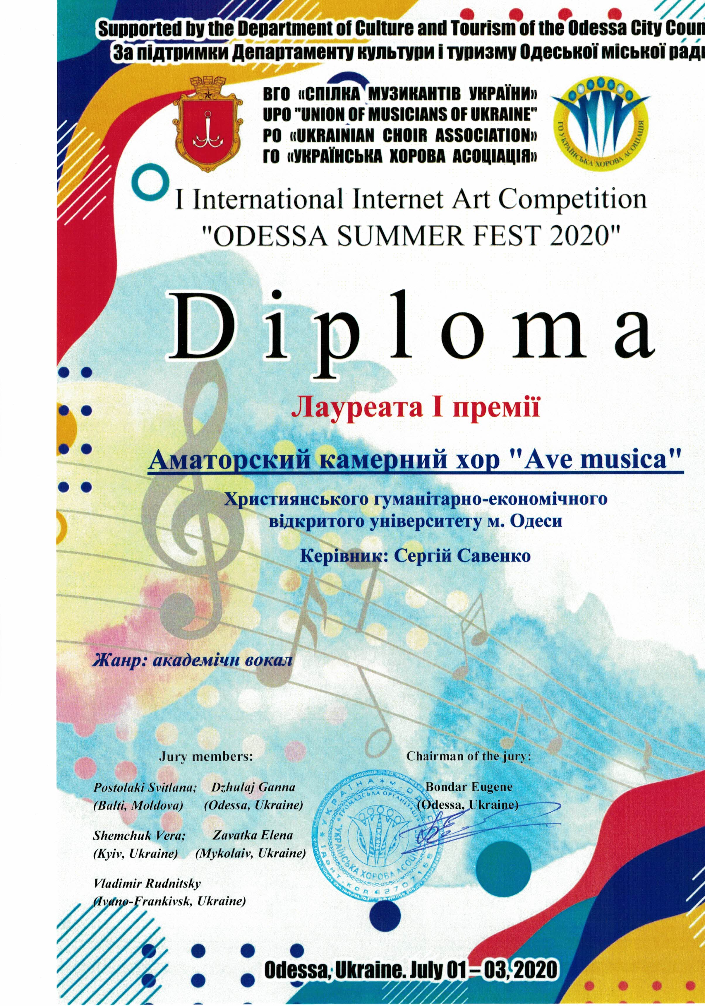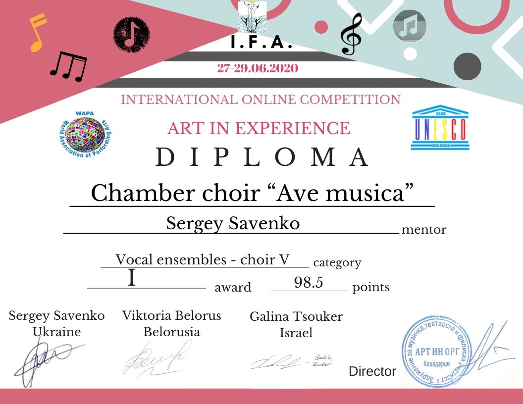 Вітаємо аматорський камерний хор "Ave musica" - керівник Сергій Савенко з перемогою у Міжнародному конкурсі в Македанії "Art in experience" - І премія, та Міжнародному інтернет конкурсі мистецтв "ODESSA SUMMER FEST 2020" Лауреат І премії!